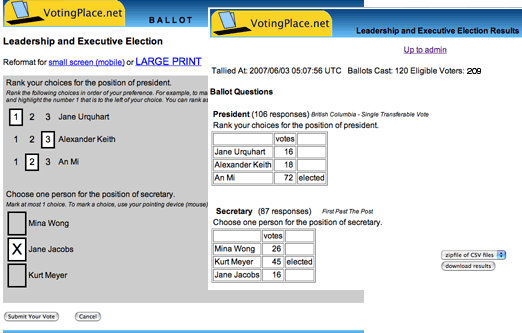 Features: secret ballots, strong encryption, upload and manage voters lists, notification of voters, fixed voting time periods or real-time motion voting, simple votes or multi-district elections / multiple voting groups, preferential ballots, brand your ballots. self-service setup (with friendly setup and administration support when you need it.) The easy and cost-effective solution for board and executive elections or policy votes. |